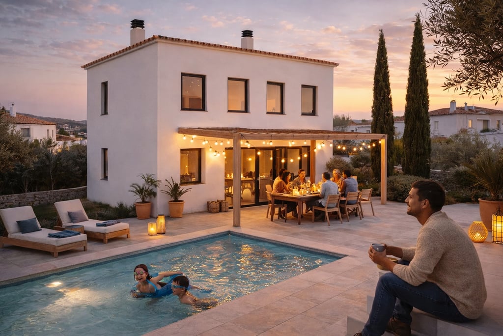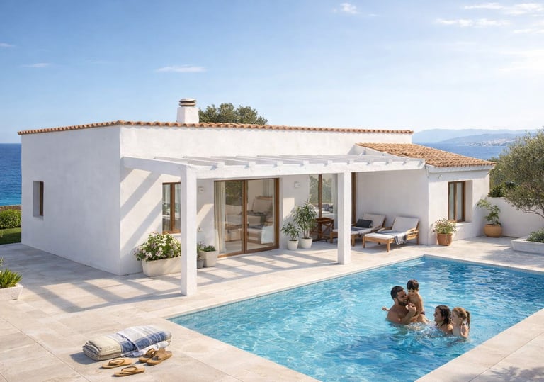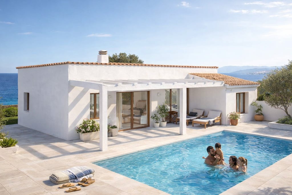 Una versión muy mediterránea del modelo Rama con piscina en el exterior y pérgola de obra.