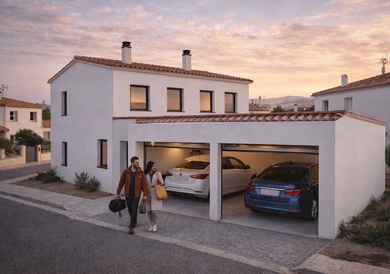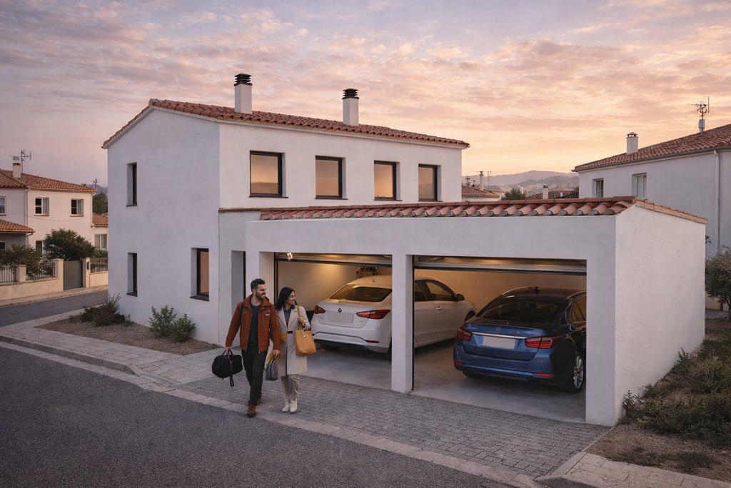 Esta versión incluye un garaje doble adosado y cerrado de una casa situada en entorno urbano.